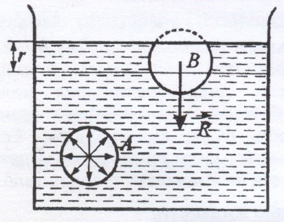 Силы, действующие на молекулу А внутри объема жидкости со стороны окружающих молекул, в среднем скомпенсированы. Для молекулы В, расположенной на поверхности, равнодействующая сил