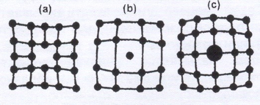 Микродефекты делятся на точечные и линейные. Точечные дефекты бывают трех типов: 1) вакансия – отсутствие атома в узле кристаллической решетки (а); 2) междоузельный атом – атом, внедрившийся в междоузельное пространство (b); 3) примесный атом – атом примеси, либо замещающий атом основного вещества в кристаллической решетке (примесь замещения (c)), либо внедрившийся в междоузельное пространство (примесь внедрения). Точечные дефекты нарушают только ближний порядок в кристаллах.