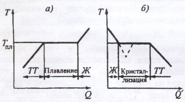 Для кристаллизации вещества необходимо наличие центров кристаллизации – кристаллических зародышей, которыми могут быть как кристаллики образующего вещества, так и любые инородные включения. Если в чистой жидкости нет центров кристаллизации, то она может быть охлаждена до температуры, меньшей температуры кристаллизации, образуя при этом переохлажденную жидкость (рис (б) – пунктир).