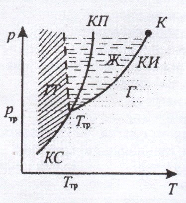 Для наглядного изображения фазовых превращений используется диаграмма состояния, на которой в координатах (p, Т) задается зависимость между температурой фазового перехода и давлением в виде кривых испарения (КИ), плавления (КП) и сублимации (КС), разделяющих поле диаграммы на три области, соответствующие условиям существования твердой (ТТ), жидкой (Ж) и газообразной (Г) фаз.