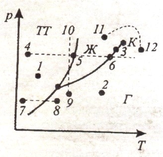Например, при условиях, обозначенных точкой 1 вещество – в твердом состоянии (ТТ), 2 – в газообразном (Г), 3 – одновременно в жидком (Ж) и газообразном.