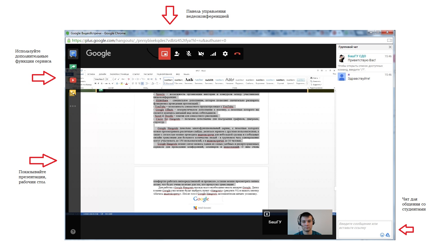 Google Hangouts довольно многофункциональный сервис, с помощью которого можно просматривать различные слайды, делиться экраном с другими пользователями, а также с легкостью можно проводить видеовстречи для небольшой группы и глобальные онлайн трансляции для большого количества людей - в групповом чате одновременно могут участвовать до 150 пользователей, а в видеовстречах до 10 человек.