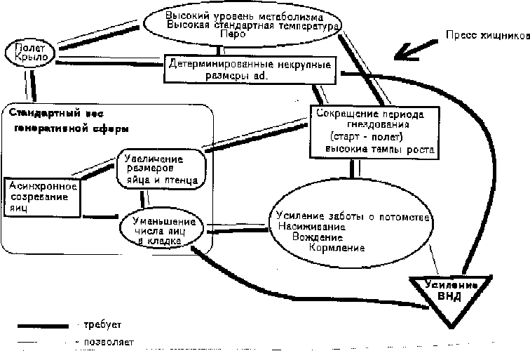 7. В период становления птиц как класса возник ряд адаптаций организованных в систему с обратными связями и включающий как общепринятые: способность к полету, высокий уровень иетаболизма, усиление заботы о потомстве, так и считавшиеся менее существенными: некрупные детерминированные размеры взрослых, быстрые темпы роста молодых, асинхронность откладки очень небольшого количества относительно крупные яиц. Эта система позволяла и заставляла совершенствовать полет и повышать уровень высшей нервной деятельности как наиболее существенные адаптации, позволяющие снижать смертность при выраженной К-стратегии.