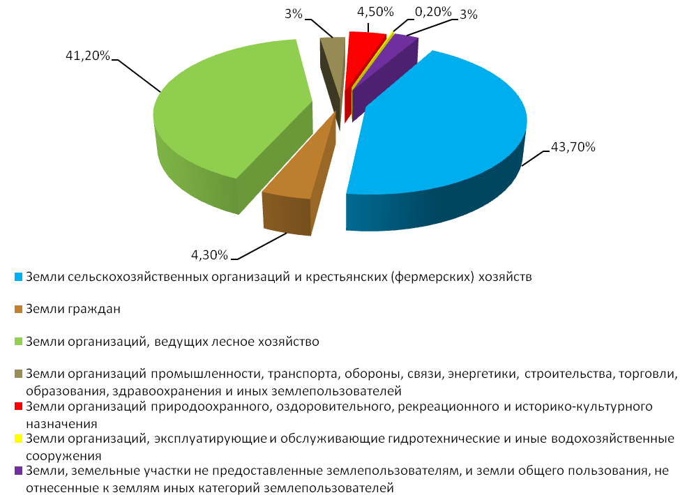 В 2015 г. наибольшая доля земель (43,7%) приходилась на земли сельскохозяйственных организаций и крестьянских (фермерских) хозяйств. С 2014 г. площадь данной категории землепользователей продолжила снижаться и за 2015 г. сократилась на 27,9 тыс. га. Площадь земель граждан за год также уменьшилась на 24,1 тыс. га.