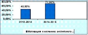Приведу наглядный пример: в диаграмме представлена положительная динамика роста уровня мотивации изучения английского языка у учащихся 11 класса. Мотивация учащихся отслеживалась с 2013 года, что позволяло мне оценивать и контролировать свою деятельность, как учителя – предметника. (Рисунок 1)