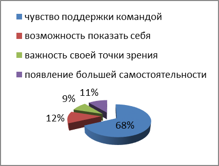 Новое всегда воспринимается учениками с особым вниманием. Данная структура помогает не только отработать необходимый лексико – грамматический материал. Для учащихся занимательна работа в группах. Опрос учащихся показал, что 68% из них чувствуют поддержку команды, и в то же время за каждым закреплена индивидуальная ответственность; 12% почувствовали большую возможность показать себя, высказать своё мнение, сделать свой выбор; 9% - впервые ощутили важность своей точки зрения, а 11% отметили, что у них появилось больше самостоятельности. Учитель уже не является центром урока. Он лишь должен уметь направлять и организовывать деятельность учащихся. (Рисунок 3)