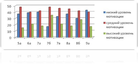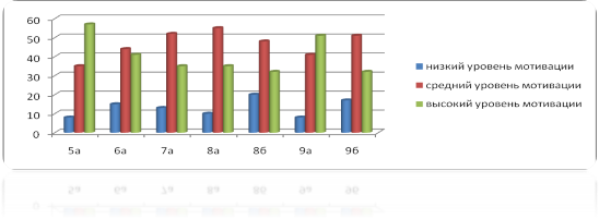 Для определения уровня мотивации учащихся на различных этапах работы по методу проектов была использована методика , «Выявление направленности и уровня развития внутренней мотивации учебной деятельности учащихся при изучении иностранного языка». В результате было выявлено, что на сентябрь 2013/2014 учебного года высок процент учащихся, имеющих низкую мотивацию к изучению предмета.(Рисунок 5)