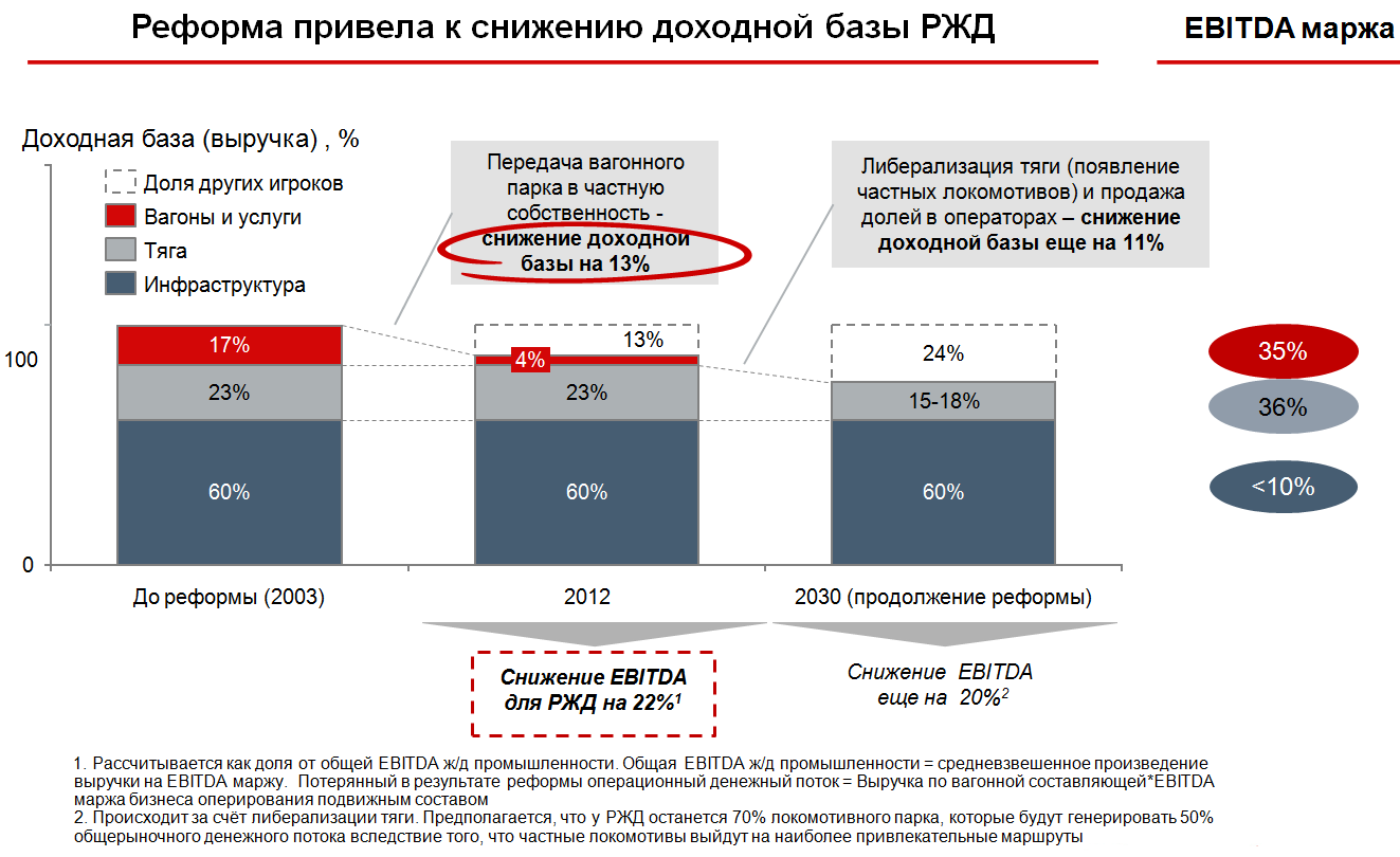 Вследствие структурной реформы Холдинг кардинально сократил присутствие на высокомаржинальном рынке оперирования и значительно снизил свои доходы от этого вида деятельности. Доходная база (выручка) услуги перевозки за период с 2003 г. до 2012 г. снизилась на 13%, а показатель EBITDA (прибыль до вычета процентных расходов, налогов и амортизации) на 22%.