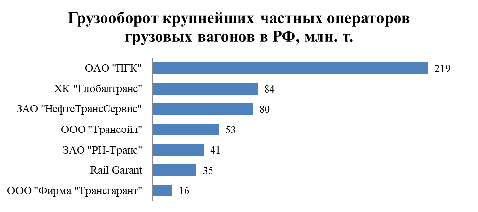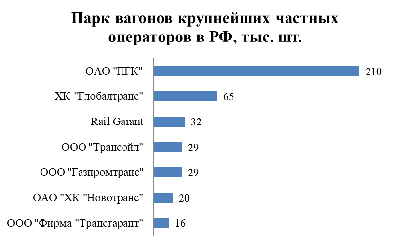 Основными конкурентами холдинга «РЖД» на российском рынке оперирования подвижным составом являются независимые частные операторы. Крупнейшими из них являются грузовая компания», ХК «Глобалтранс» (входит в «Н-Транс»), , Трансгарант» (группа FESCO), Новотранс», , ГК «Евросиб», «Дальневосточная транспортная группа» (ДВТГ). Всего в 2012 г. частным операторам принадлежало около 900 тыс. вагонов из