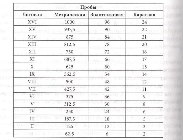 Илл. 1. Соотношение лотовой, метрической, золотниковой и каратной проб драгоценных металлов и сплавов
