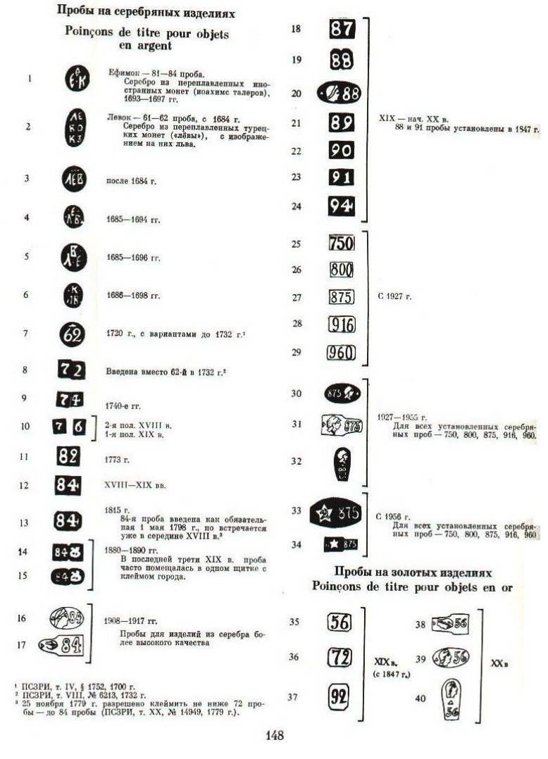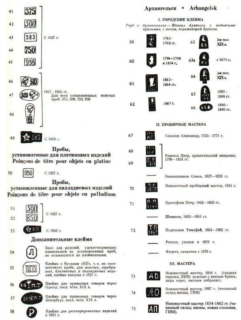 Илл. 2. Пробы на серебряных изделиях, пробы на золотых изделиях, пробы установленные для платиновых изделий, пробы установленные для палладиевых изделий, дополнительные клейма. Городские клейма, клейма пробирных мастеров и мастеров на примере клейм Архангельска