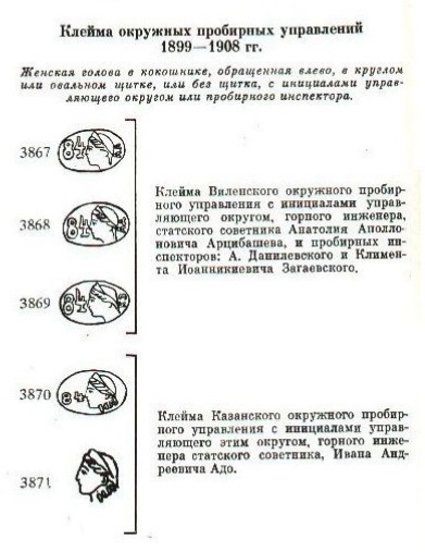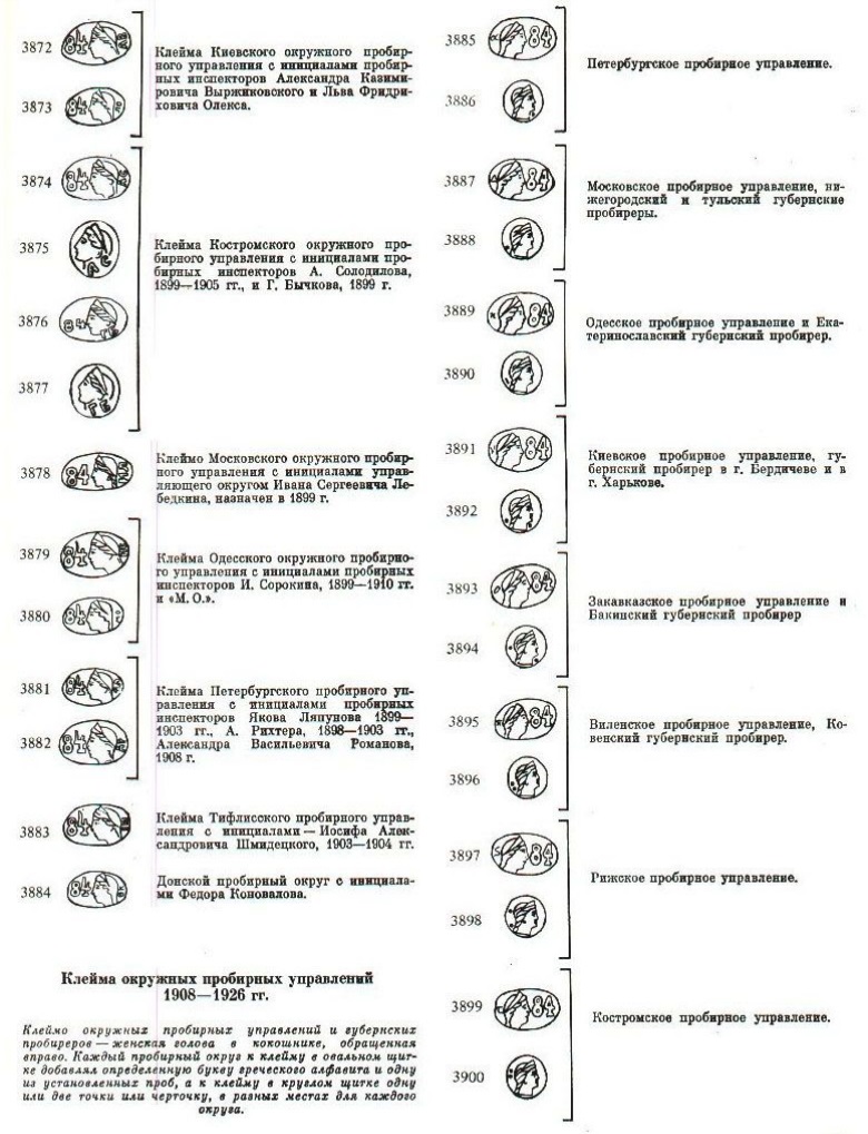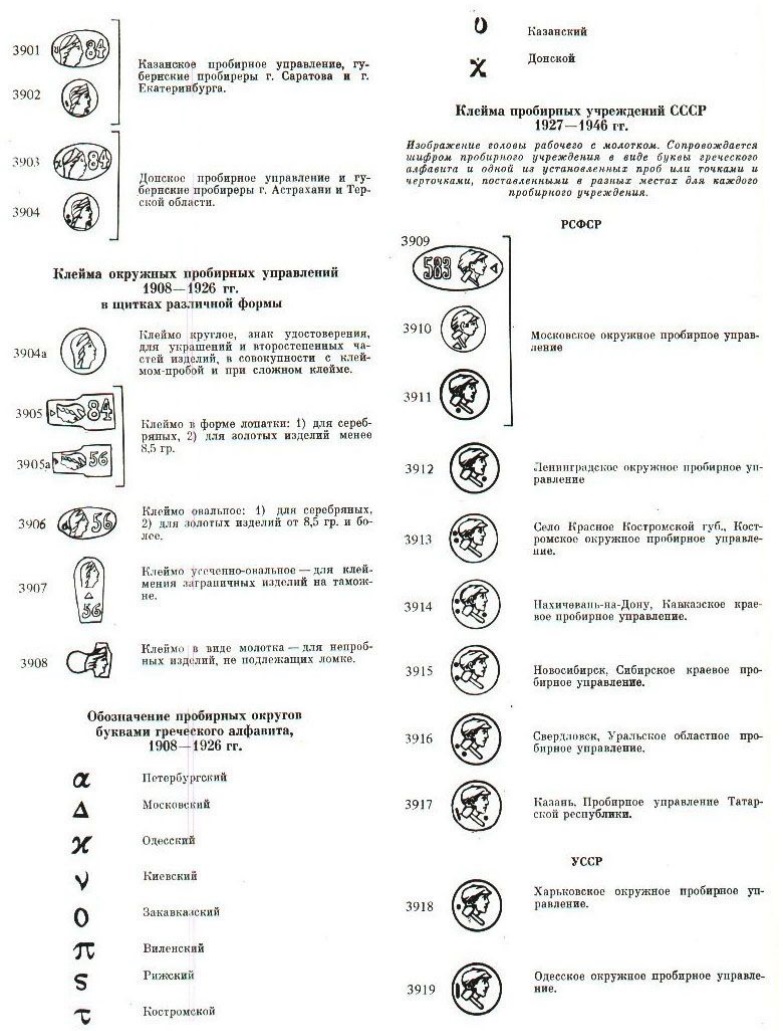 Илл. 3. Клейма окружных пробирных управлений 1899-1908 гг., 1908-1926 гг., 1908-1926 гг.(в щитках различной формы), обозначение пробирных округов буквами греческого алфавита 1908-1926 гг., клейма пробирных учреждений СССР 1926-1946 гг.