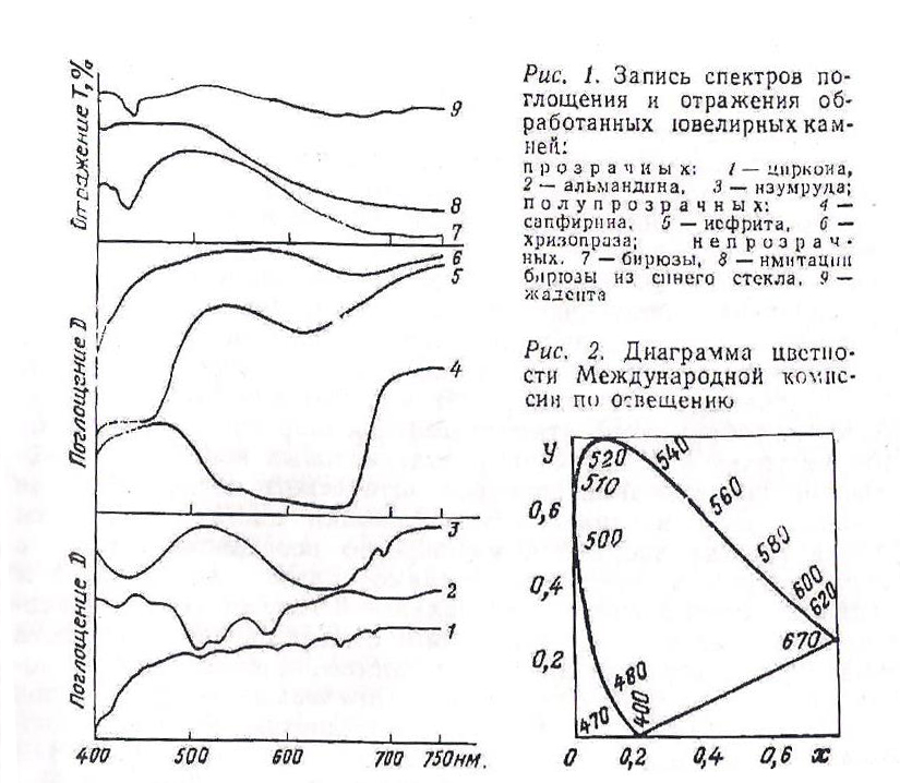 Илл. 4. Запись спектров поглощения и отражения обработанных ювелирных камней и диаграмма цветности Международной комиссии по освещению