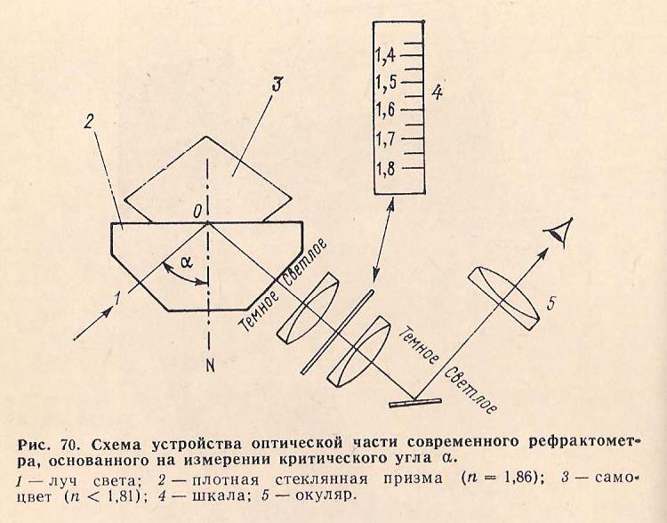Илл. 9. Схема устройства оптической части рефрактометра, основанного на измерении критического угла a.