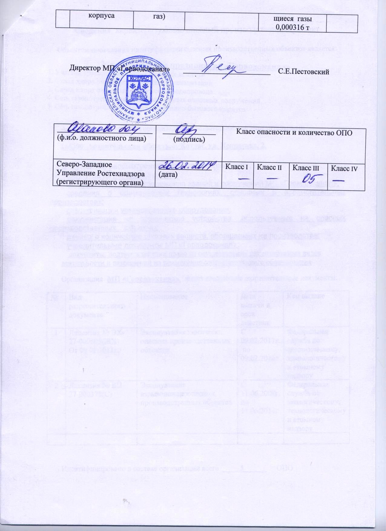 4 | Сеть газопотребления канализацион ных очистных сооружений | Использование опасного вещества (Природный газ) | 1) Котёл отопительный водогрейный стальной «Хопёр - 63 А» с электроуправляемой автоматикой «КСУ-Б-20»- 2 шт., заводские номера №9, №12; Р=0,3 МПа Qпр.=7.3 мі/час 2) Котёл отопительный водогрейный стальной «Хопёр - 25 А» с газогорелочным устройством и автоматикой –2шт. заводские номера №14, №20; Р=0,3 МПа Qпр.=2,8 мі/час 3) Котёл отопительный водогрейный стальной «Хопёр - 100 А» с газогорелочным устройством и автоматикой заводские номера № 000, № 000; Р=0,3 МПа Qпр.=10.7 мі/час 4) Участок газопровода высокого давления наружный подземный от отключающей задвижки до ГРПШ 5) Участок газопровода низкого давления наружный надземный от ГРПШ до отключающей задвижки на вводе в котельную 6) Газопровод низкого давления внутренний (котельная) Природный газ | 1) Дата ввода в эксплуатацию 25.10.2005г. 2) Дата ввода в эксплуатацию 21.10.2005г. 3) Дата ввода в эксплуатацию 15.10.2005г. 4) Диаметр 57 мм Р=0,4 МПа Дата ввода в эксплуатацию 25.10.2005г. Q=20.8 мі/час 5) Диаметр 89 мм Р=0,003 МПа Диаметр 57 мм Р=0,003 МПа Диаметр 40 мм Р=0,003 МПа Q=20.8 мі/час Дата ввода в эксплуатацию 25.10.2005г. 6) Диаметр 32 мм Р=0,003 МПа Дата ввода в эксплуатацию 25.10.2005г. Воспламеняю-щиеся газы 0,007 т | 2.1 |