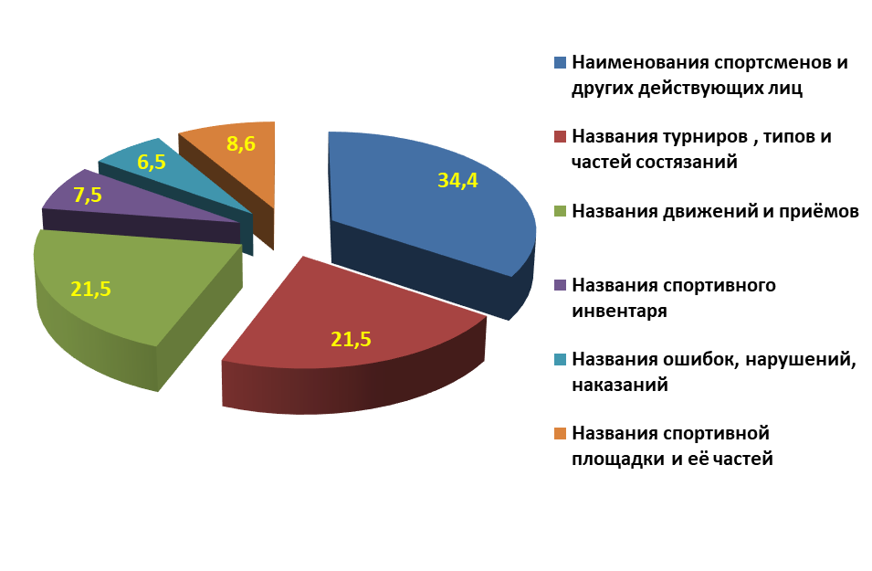 Среди тематических групп самой многочисленной является группа наименований спортсменов и других действующих лиц (34,4%). Это связано с тем, что данные слова обозначают многочисленные функции игроков (плеймейкер, легионер, латераль). Данная группа слов подробнее рассмотрена в главе 3.