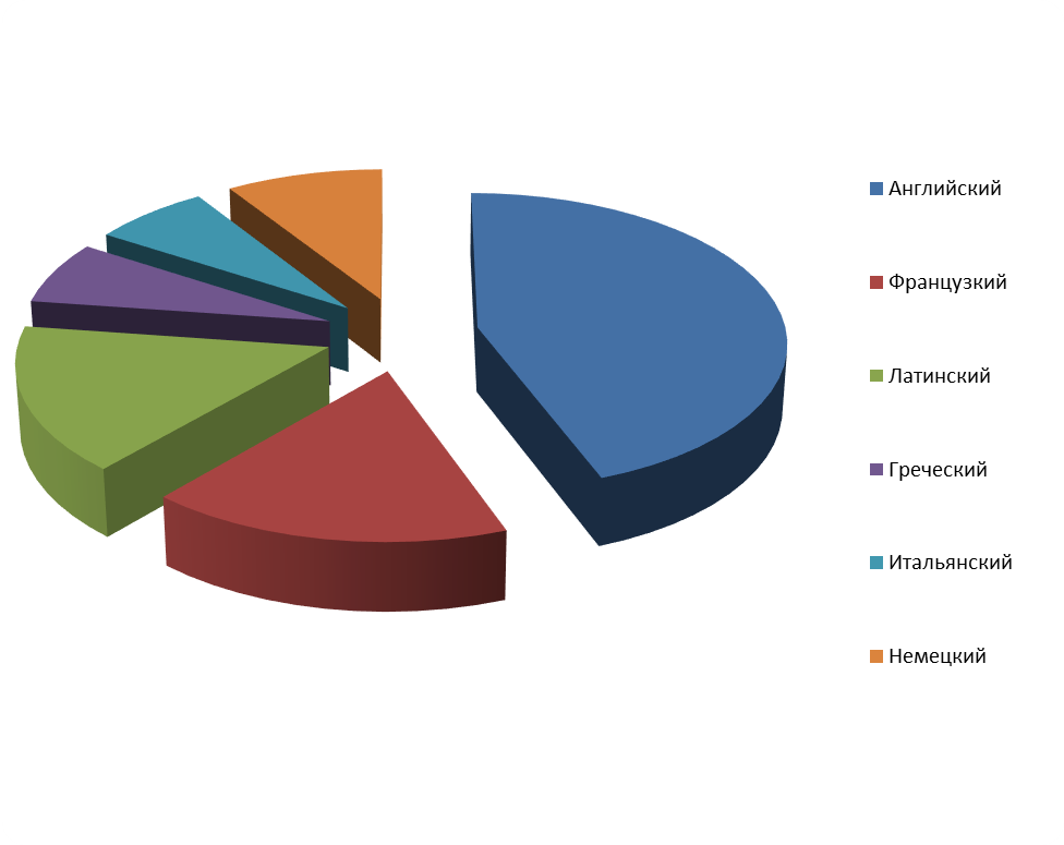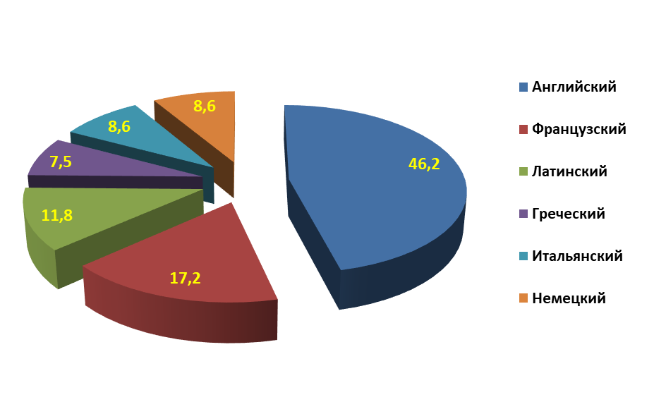 Иноязычные спортивные термины являются неотъемлемой частью современного русского языка. В спортивной лексике процент английских заимствований всегда был высок. Среди анализируемых слов английская лексика составляет 46,2% (см. Приложение 1). Это связано с тем, что именно Англия является той страной, где на протяжении веков развивается футбол и его терминология, которая затем берётся за основу во всех европейских странах. Английская лексика представлена во всех тематических группах за исключением названий спортивной площадки и её частей. Французская лексика составляет 17,2% от общего количества терминов. В основном она представлена в двух тематических группах: названия турниров, типов и частей состязаний и названия движений и приёмов. Все термины этой группы общеупотребительные, одно из значений которых имеет отношение к спорту. Слова латинского (11,8%) и греческого (7,5%) происхождения также являются общеупотребительными и представлены во всех тематических группах. Термины итальянского происхождения составляют 8,6% от всех проанализированных слов, большая часть их относится к группе «наименования спортсменов и других действующих лиц». Итальянские термины, обозначающие игроков, не получили широкого распространения в русском языке, возможно, из-за непривычного для русского языка построения слова. Лексика немецкого происхождения (8,6%) находится во всех тематических группах, большая часть этих слов относится к военной лексике.