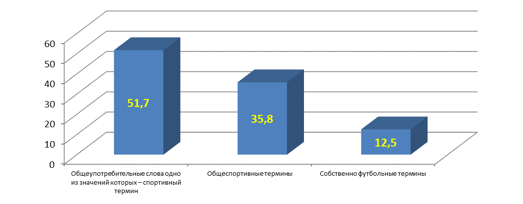 Собственно футбольные термины составляют самую немногочисленную группу слов 12,5%. Эта группа состоит только из терминов, имеющих итальянское и английское происхождение. Лишь 2-3 термина знакомы людям, которые интересуются футболом (пенальти, корнер, офсайд). Остальные слова могут понять только специалисты, те, кто профессионально занимается этим видом спорта (треквартиста, латераль).