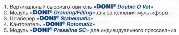 остановка творожного зерна (1), регулируемый дренаж сыворотки и заполнение мультиформ (2), прессование продукта в мультиформах (5), штабелирование мультиформ в паллеты (3). Транспортирование паллетов в холодильную камеру, упаковка.