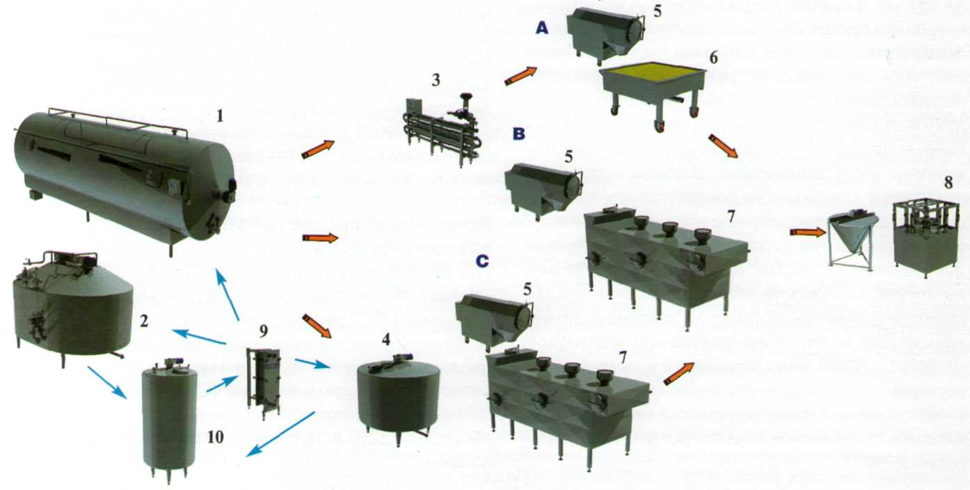 Все этапы производства от сквашивания до охлаждения практически полностью вписываются в принятую нами концепцию построения линии. Закрытый процесс, конструкция каждой отдельной единицы оборудования позволяют мыть его в автоматическом режиме. Работа всей линии управляется посредством программируемого контроллера.
