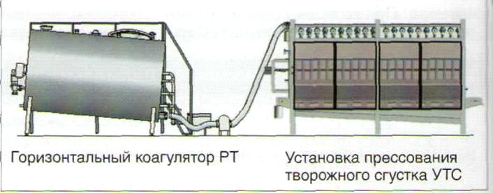 - закрытый горизонтальный творожный коагулятор; насосная система подачи сгустка и отбора сыворотки;