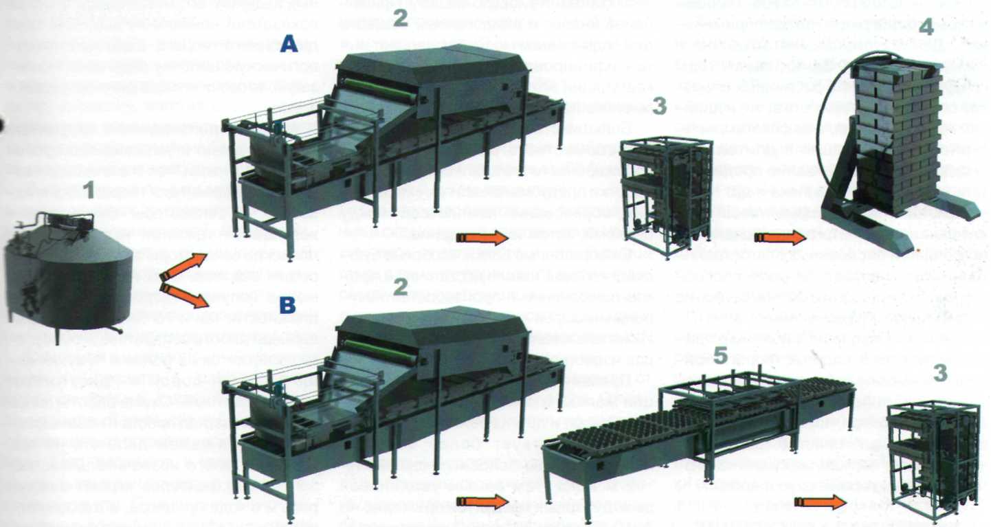 остановка творожного зерна (1), регулируемый дренаж сыворотки и заполнение мультиформ (2), штабелирование мультиформ в паллеты (3), переворачивание на кантователе, дренирование сыворотки и самопрессование (4). Транспортирование паллетов в холодильную камеру, упаковка.
