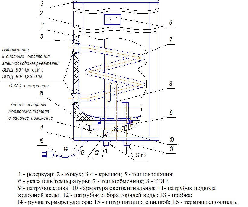 Водонагреватели ЭВАД-80/1,6-01М и ЭВАД-80/1,25-01М дополнительно оснащены теплообменником 7.