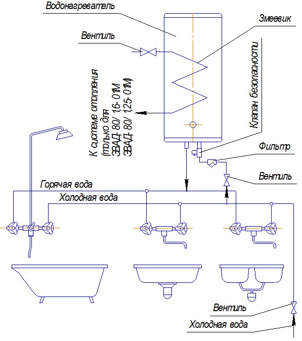 Схема подключения водонагревателей к трубопроводу, системе отопления и местам разбора горячей воды показана на рисунке 1.