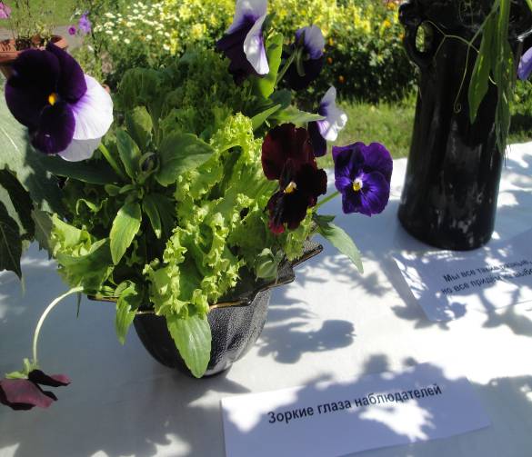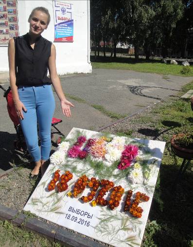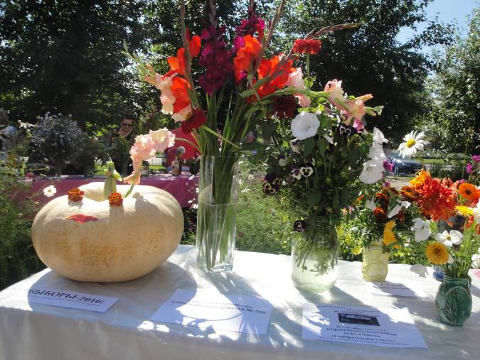 Цветочные композиции ТИК тоже отражали исключительно выборную тематику. Большой разноцветный букет носил название «Мы все такие разные, но все пойдем на выборы», красные сальвии символизировали «галочку» в избирательном бюллетене, композиция из анютиных глазок называлась «Зоркие глаза наблюдателей», одиноко стоявшего гладиолуса сопровождал призыв: «Российский избиратель, в стороне не стой!», маленький георгинчик в вазе рядом с более крупными гордился: «Иду на выборы с мамой и папой». А главное внимание посетителей привлекала цветочная композиция «Выборы 18.09.2016» (автор и исполнитель член ТИК Анастасия Мулярчик). Эта композиция стала победителем выставки-конкурса «Вальс цветов» в номинации «Баннер из цветов».