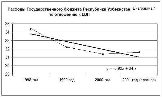 Прогноз на 2001 год общие расходы Государственного бюджета (без целевых фондов) Республики Узбекистан составляет 1210,3 млрд. сум, из них социальную сферу 481,8 млрд. сум, на социальную защиту населения 102,9 млрд сум, расходы на экономику 90,4 млрд сум, расходы на централизованную инвестицию 216,2 млрд сум, содержание государственного управления 22 млрд сум, расходы на геологоразветку 15 млрд сум, резервный фонд Кабинета Министров Республики Узбекистан 15 млрд сум, расходы по обслуживанию Государственного долга 72,6 млрд сум, прочие расходы 214,1 млрд сум.(Таблица 5).