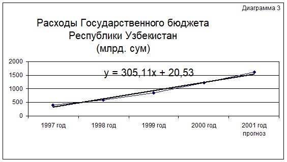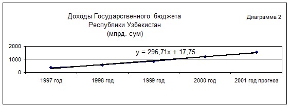 Анализируя доходы и расходы Государственного бюджета Республики Узбекистан за предыдущие годы (1997-2001гг), а также на основе построенных линий тренда можно сделать вывод, что доходы увеличиваются в среднем на 296,71 млрд. сум, а расходы на 305,11 млрд. сум. Следовательно, можем прогнозировать на 2002 год доходы 1798,01 млрд. сум, а расходы 1851,19 млрд. сум. (Диаграммы 2, 3).
