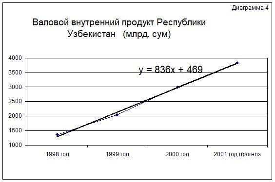 Проведя соответствующие исследования с количественными данными за предыдущие годы ВВП (Диаграмма 4) приходим к выводу, что ВВП в среднем увеличивается на 836 млрд. сум, и следовательно ожидаемое значение ВВП на 2002 год составляет 4649 млрд. сум.