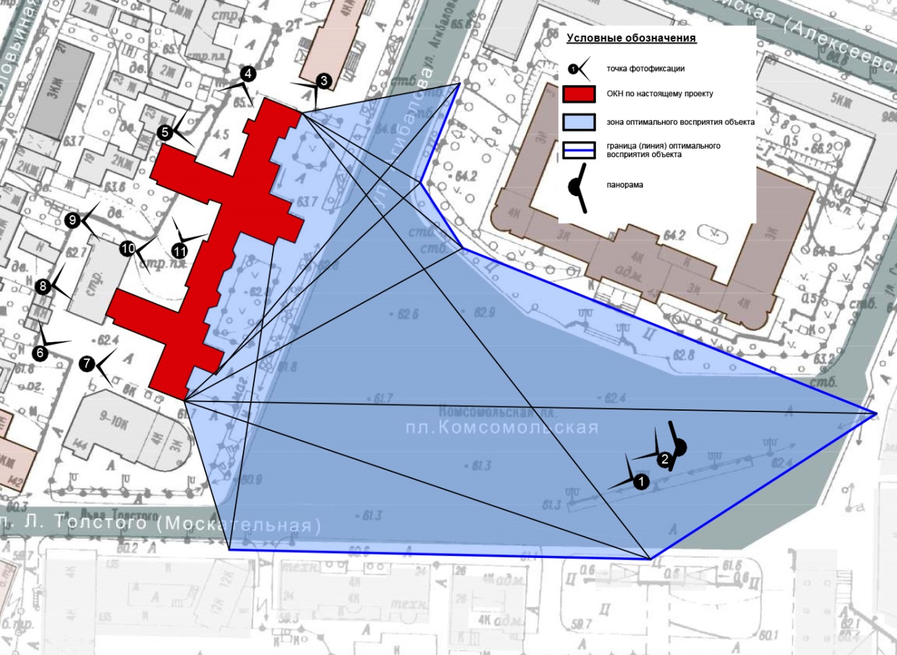 Комплексный анализ видового раскрытия ОКН, включающий натурные наблюдения, фотофиксацию и графическую модель (план фрагмента территории с указанием точек фотофиксации, с которых характерные особенности архитектуры объекта и предметы его охраны раскрываются для обзора с максимальной эффективностью), позволяет установить структуру видового раскрытия. При фотофиксации архитектурно-художественного облика ОКН учитывалось, что охрана активной композиционной роли ОКН (памятников архитектуры и исторических ансамблей) означает, прежде всего, охрану ценных видов, в которых памятники архитектуры, городская застройка и элементы природного окружения выступают в неповторимых, характерных только для этого участка города сочетаниях.