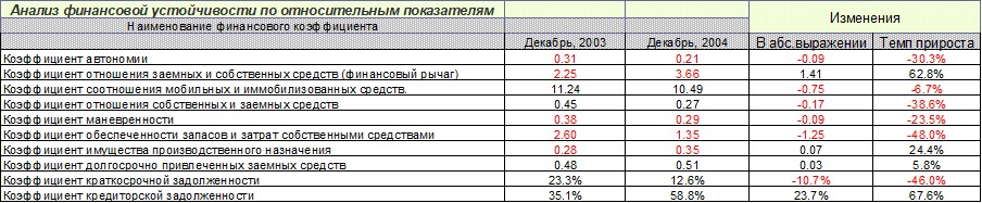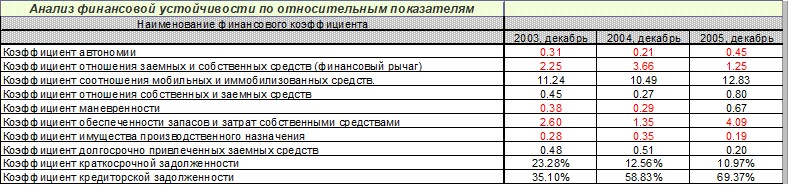 Показатель 'Коэффициент автономии', за анализируемый период снизился на 0,00 и на конец дек. 2004 составил 0,00. Это ниже нормативного значения (0,5) при котором заемный капитал может быть компенсирован собственностью предприятия.
