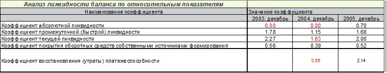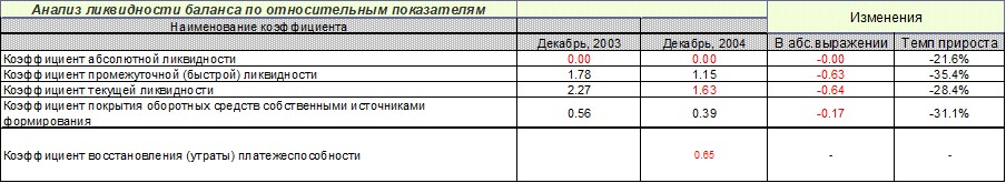 Коэффициент абсолютной ликвидности и на начало и на конец анализируемого периода (дек. 2003-дек. 2004) находится ниже нормативного значения (0,2), что говорит о том, что значение коэффициента слишком низко и предприятие не в полной мере обеспечено средствами для своевременного погашения наиболее срочных обязательств за счет наиболее ликвидных активов. На начало анализируемого периода - на конец дек. 2003 значение показателя абсолютной ликвидности составило 0,00. На конец анализируемого периода значение показателя снизилось, и составило 0,00.
