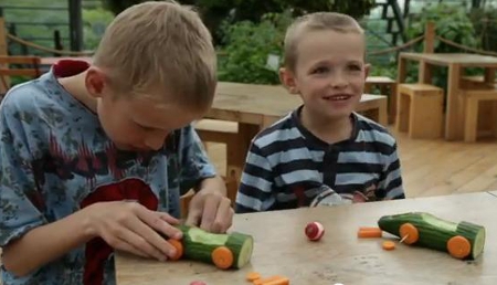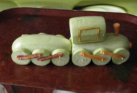 Из огурцов и моркови мальчишкам будет интересно сделать гоночные машинки. Шлем гонщика заменит редиска. Видео-инструкцию по изготовлению этой поделки из овощей см. по ссылке >>>>