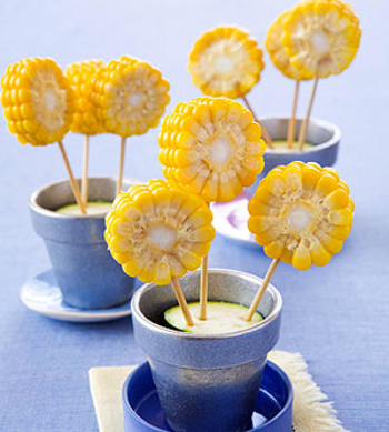 Украсьте цветочки, сделав им сердцевинку из небольших кусочков свеклы или зернышек кукурузы. Кстати, из початков кукурузы тоже можно сделать замечательный букет цветов.