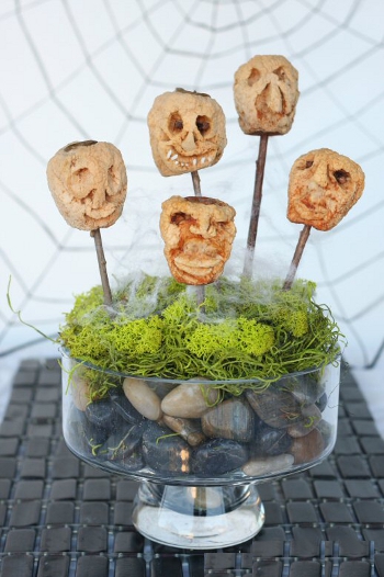 Эта морщинистая голова Бабы-Яги сделана из обычного яблока. Для изготовления симпатичного создания возьмите яблоко твердых сортов, очистите его от кожуры. Вокруг хвостика яблока можно оставить небольшой "островок" кожуры. После этого маркером наметьте черты будущего лица: глаза, рот, нос. Все эдетали должны быть достаточно крупные, чтобы не исчезнуть после того, как яблоко сморщится.