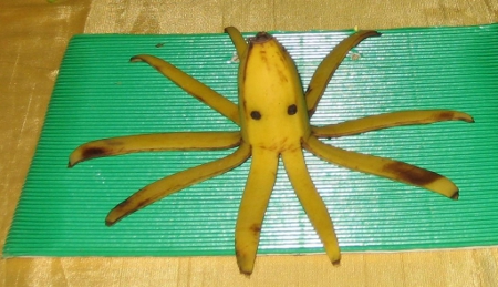 Осьминог из банана. Глазки сделаны из горошин черного перца.