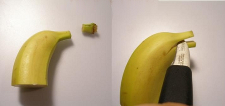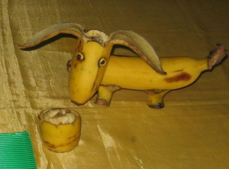 Голова делается следующим образом: очистите второй банан примерно наполовину, часть кожуры отрежьте, чтобы из оставшейся получились ушки будующей таксы. Отогните ушки в стороны, приделайте глазки - горошины черного перца, после чего прикрепите голову к туловищу. Поделка из фруктов - собачка готова!