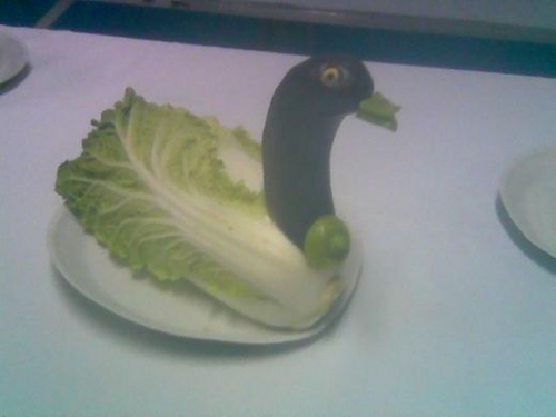 Из баклажана изогнутой формы и кочана пекинской капусты получится уточка. Клюв и грудка у этой поделки из овощей выполнены из зеленого сладкого перца.