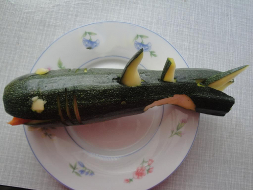 Вот такую морскую хищницу можно сделать из безобидного кабачка. Если нет кабачка, то его заменит огурец крупного размера. См. инструкцию по ссылкам: