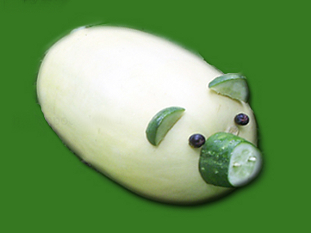 Поросенок из кабачка. Уши и пятачок сделаны из огурца, глазки - из ягод черноплодной рябины. См. ссылку >>>>