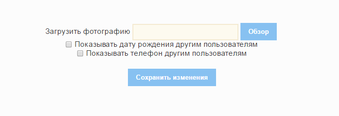 - «Загрузить фотографию» - для загрузки фотографии нажмите на кнопку «Обзор» и загрузите фотографию с жесткого диска; «Показывать дату рождения другим пользователям» - при установлении «флажка» дата рождения становится доступной для просмотра другим пользователям; «Показывать телефон другим пользователям» - при установлении «флажка» номер телефона становится доступным для просмотра другим пользователям.