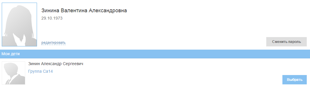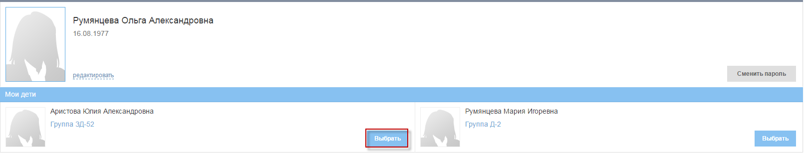 Примечание – Если пользователь с ролью «Родитель» имеет несколько детей, Система предложит ему выбрать ребенка, информацию по которому необходимо просматривать. Для этого напротив ФИО ребенка нажмите кнопку «Выбрать» (Рисунок 13). Далее в правом верхнем углу под ФИО родителя отображается ФИО выбранного ребенка.