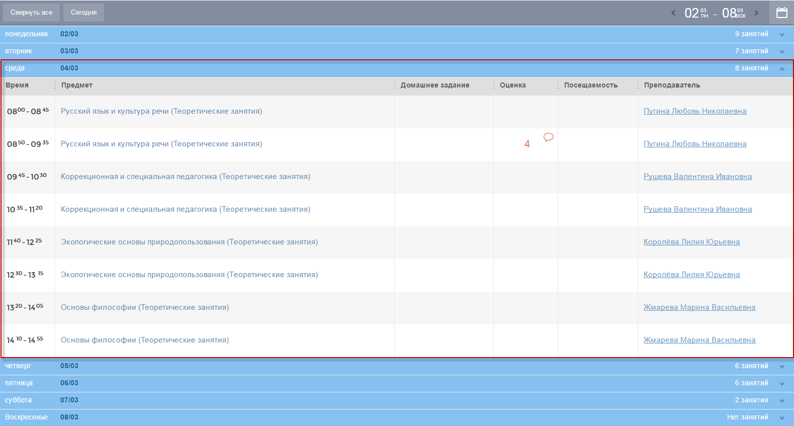 Для просмотра информации по определенному дню недели нажмите на запись с тем днем недели и с той датой, информацию по которой вы хотите просмотреть, Система раскроет выбранную запись (Рисунок 14). Информация представлена в виде таблицы, которая состоит из следующих граф: