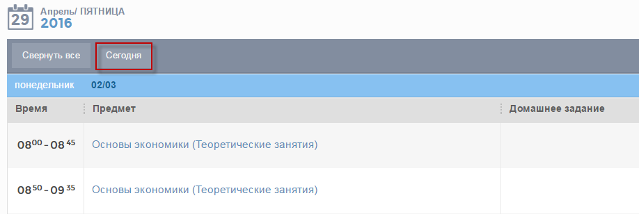 Для просмотра дневника на текущую дату на верхней панели кнопок нажмите кнопку «Сегодня» (Рисунок 16), Система раскроет информацию по текущей дате.