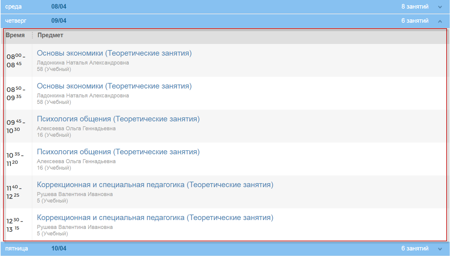 Рисунок 14 – Просмотр расписания на определенный день недели