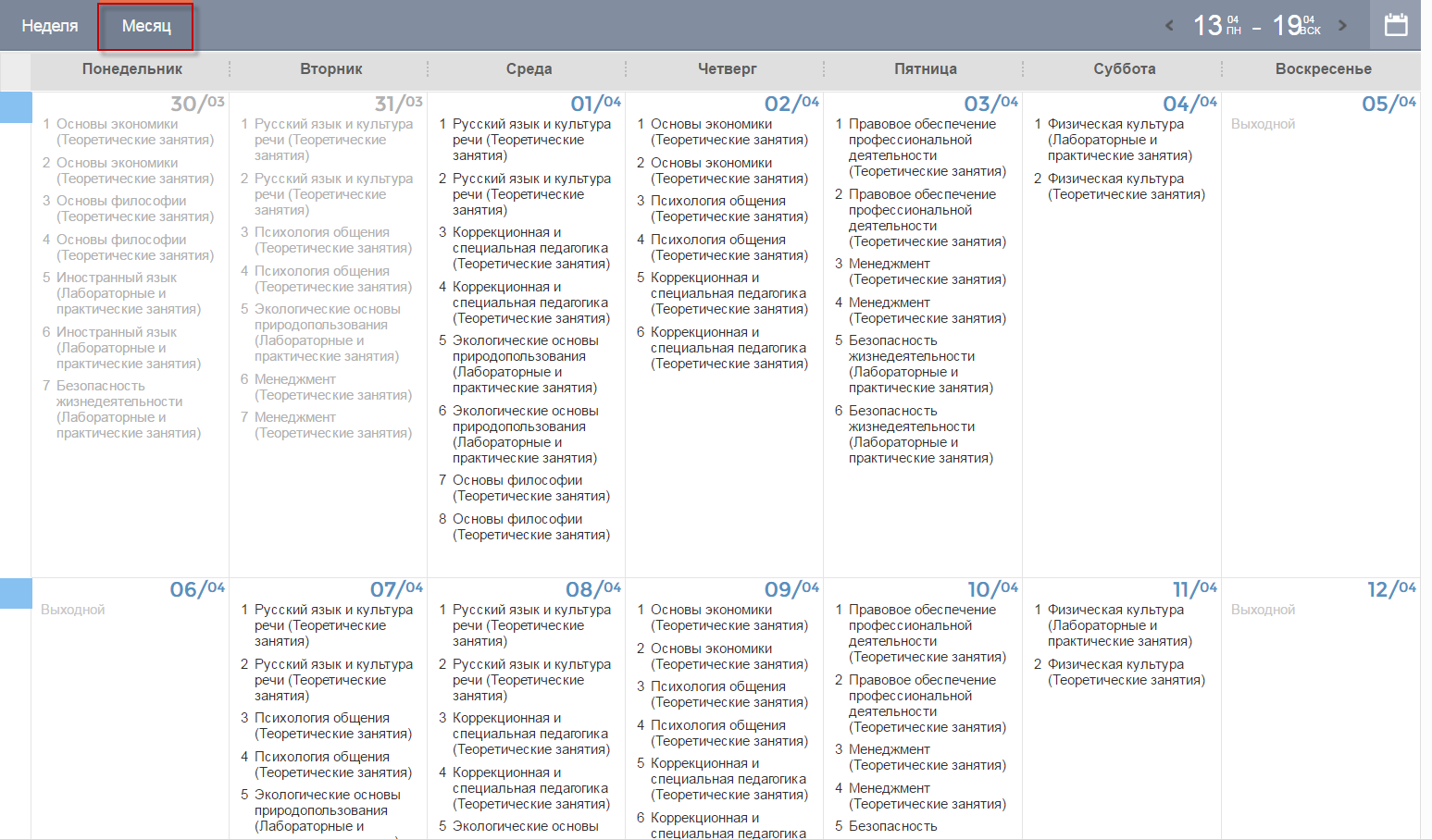 Для просмотра расписания на месяц на верхней панели кнопок нажмите кнопку «Месяц» (Рисунок 19), откроется окно, содержащее расписание занятий на каждый день в течение месяца.