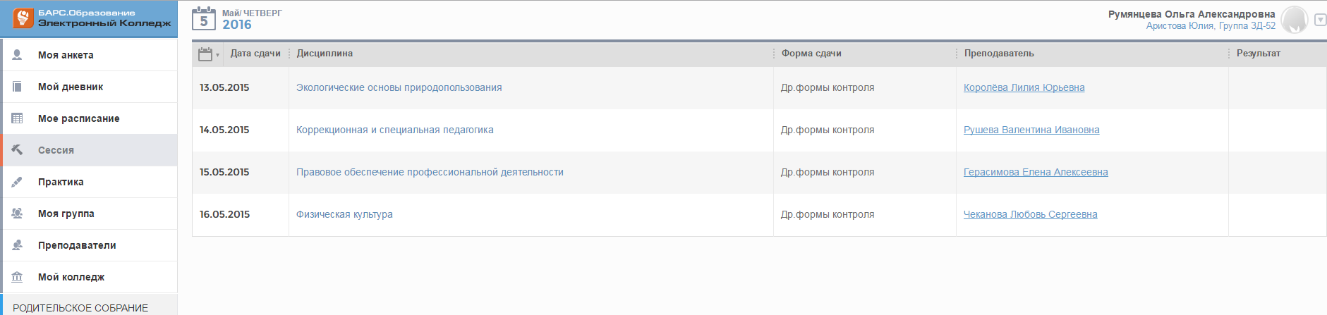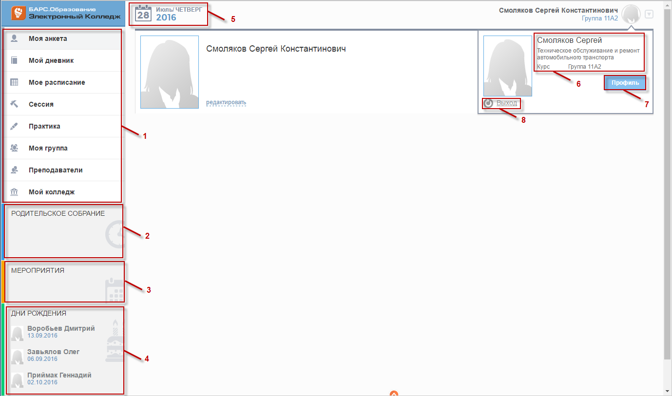 - «Моя анкета»; «Мой дневник»; «Мое расписание»; «Сессия»; «Практика»; «Моя группа»; «Преподаватели»; «Мой колледж».